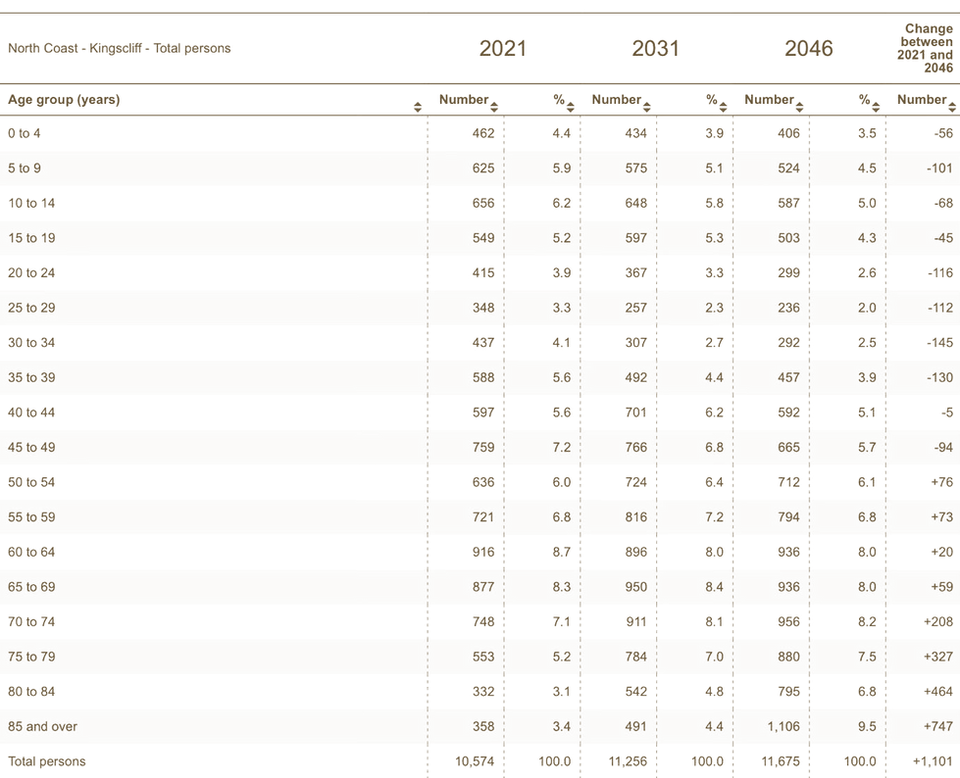 Significant increases in the 55–85+ cohorts, particularly in Casuarina, where the 85+ population is projected to grow from 47 (1.1%) in 2021 to 534 (7.8%) in 2046 (+487 people).